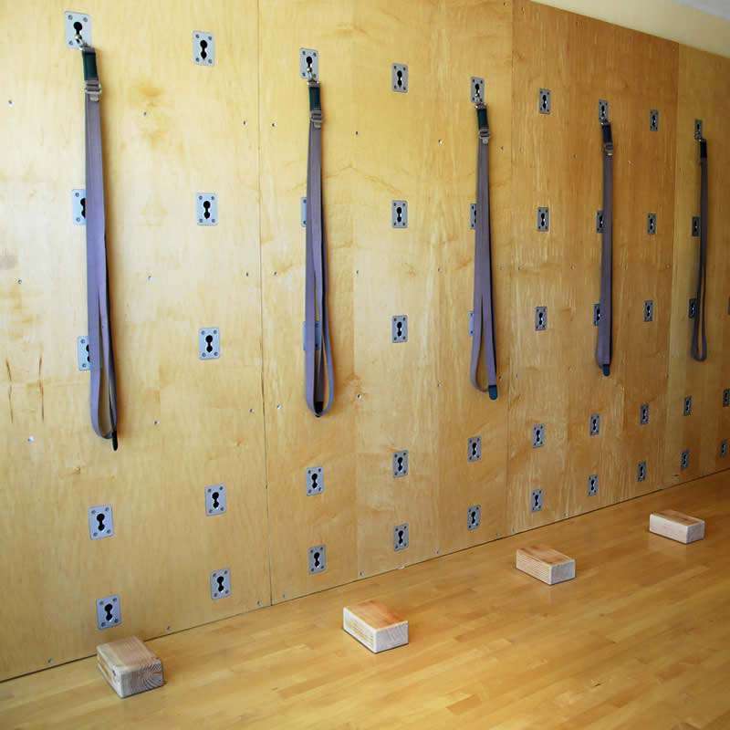 The yoga wall is designed around Great Yoga Wall's patented ball-and-socket hardware system. You mount the spring-loaded socket wall plate into 3/4" (19mm) hardwood veneer plywood. The wall belts and bars snap into the wall plates with a brass ball. This system allows for tremendous flexibility of use. The basic setup has 3 rows of wall plates. The deluxe setup has 5 rows of plates. The plates are mounted to the plywood in columns 16" (407mm) apart. The plywood is then attached to a wall by bolting 2"x4"s (51mm x 102mm) horizontally into existing wall studs and then screwing the plywood into the 2x4s. We have a template available, used with a router, to prepare the plywood for the wall plates.